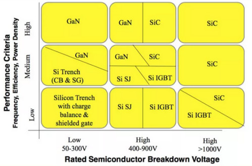 目前碳化硅功率器件主要定位于功率在1kw-500kw之间、工作频率在10KHz-100MHz之间的场景,特别是一些对于能量效率和空间尺寸要求较高的应用,如电动汽车车载充电机与电驱系统、充电桩、光伏微型逆变器、高铁、智能电网、工业级电源等领域,可取代部分硅基MOSFET与IGBT。