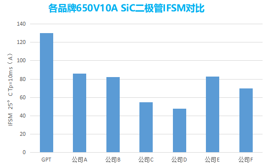 G5S06510AT的IFSM在Tc=25°C,tp=10ms,HalfSineWave测试条件下为130A,达到了业内最高水平,更高的IFSM可以提高器件在工作中抗电流冲击的能力,改善器件在应对突发意外时的工作可靠性,降低系统的运营维护成本。
