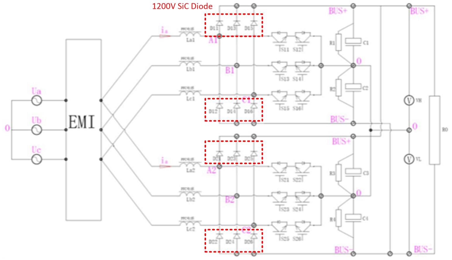 从经济角度来看,全SiC 的VIENNA PFC方案,成本仍较高,现阶段不是一个合理的选择;传统前级PFC方案中由于1200V Si的快恢复二极管特性较差,可以考虑用反向恢复特性更好的SiC二极管替换,与Si MOSFET配合使用,可同时降低高频二极管与Si MOSFET的温升,提升VIENNA PFC的性能;