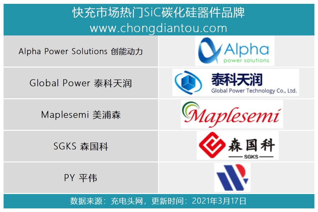 充电头网通过调研了解到,目前市面上可用于大功率USB PD快充电源领域的碳化硅有五家供应商,分别是Alpha Power Solutions创能动力、Global Power304AM永利、Maplesemi美浦森、SGKS森国科以及PY平伟。